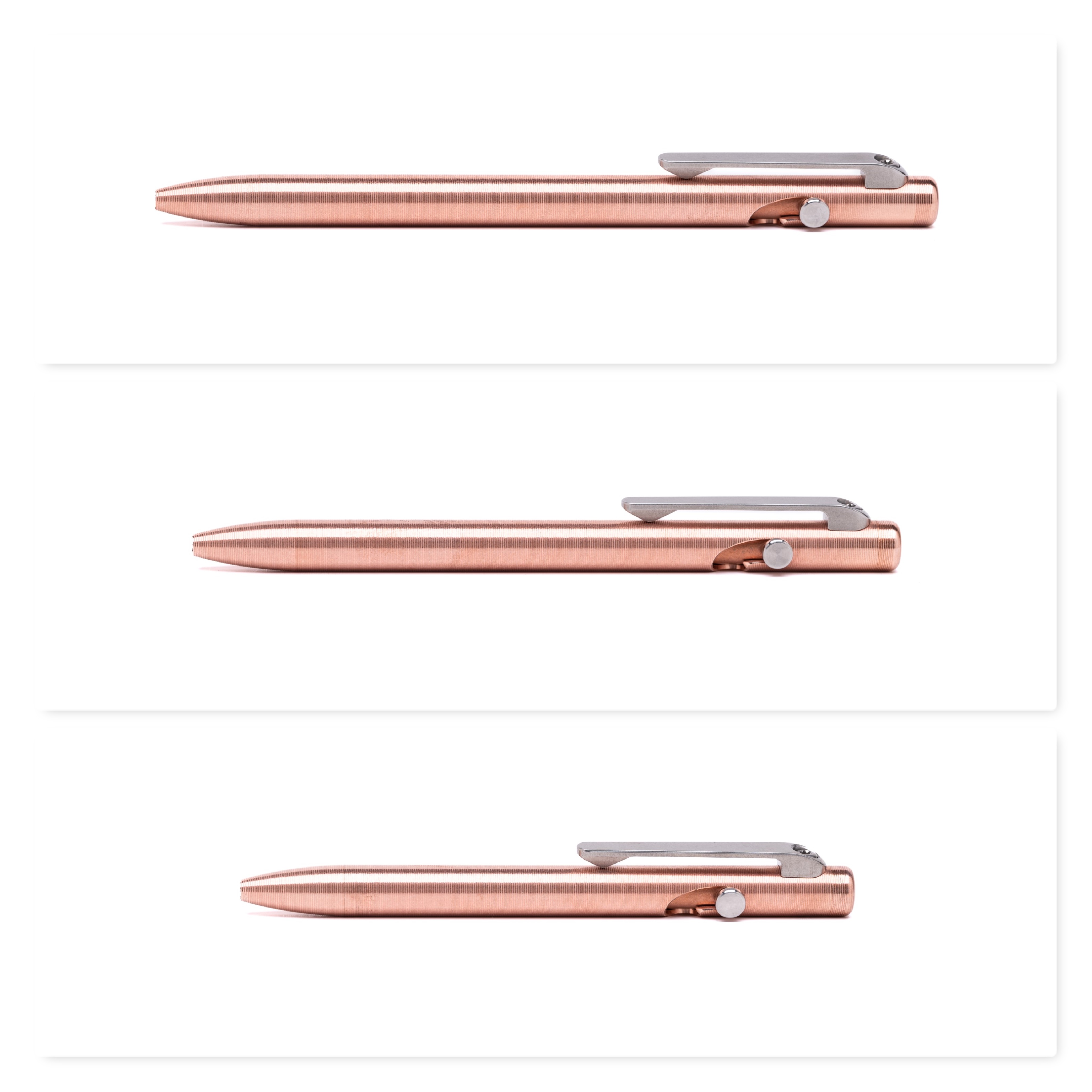 Die Slim Bolt Action messen im Durchmesser 9,3mm, während die „normalen“ Bolt Action auf ca. 11mm kommen. Dies lässt selbst die schwereren Metalle wie Bronze und Kupfer in der Hand um einiges leichter und führiger werden. Der Gewichtsunterschied von 19 Gramm (Bolt Action Copper mit ca. 64g vs. Slim Bolt Action Cooper mit ca. 45g) mag auf dem Papier nach nicht viel klingen; die 30% weniger Gewicht sind in der Hand jedoch deutlich spürbar!