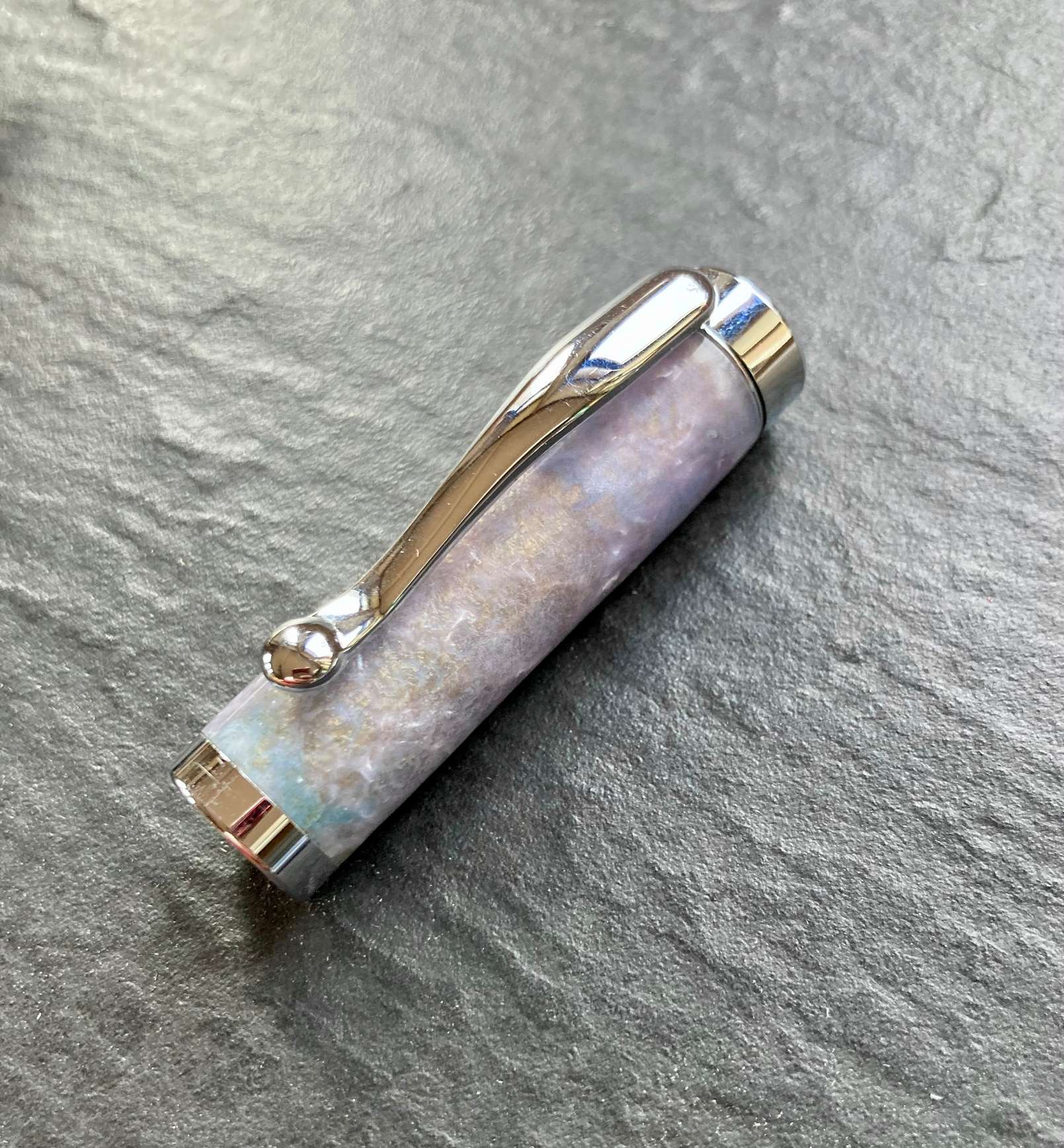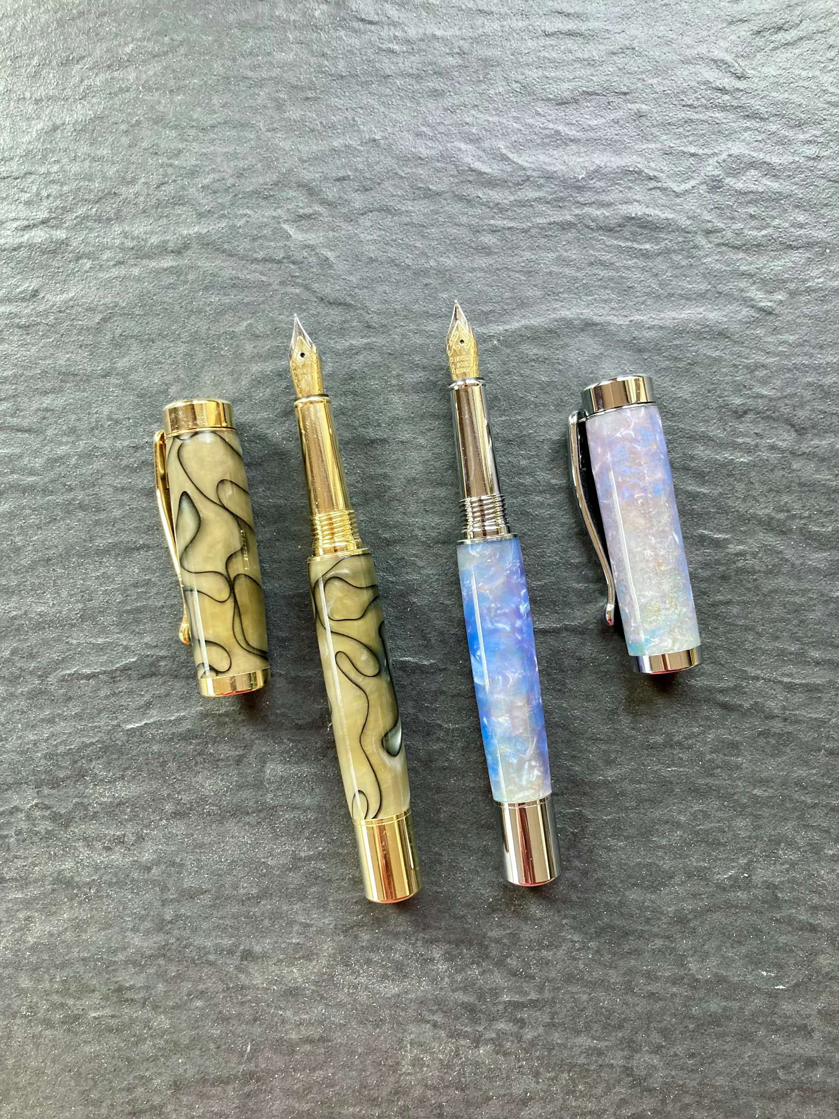 Das erste Bild zeigt die fertig gedrechselten Schreibgeräte (30a vergoldet mit Acryl Pen Blank AA-X).