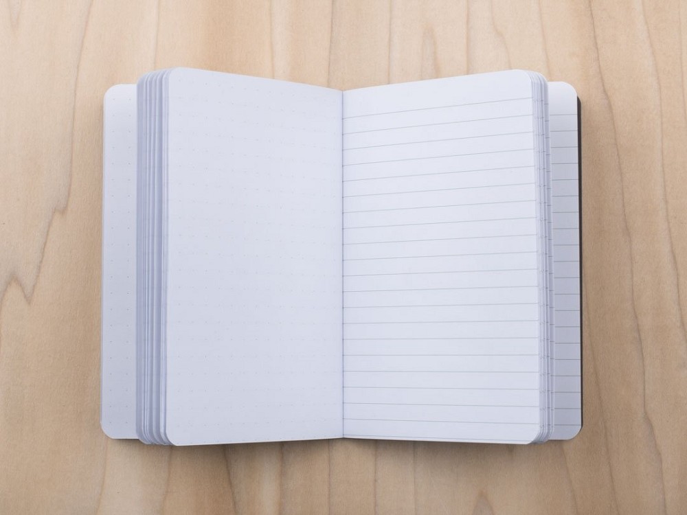 Das 64 Seiten starke Notizbüchlein wird aus Papier der Sorte 70# von Write Notepads in Baltimore, MD gebunden. Aufgrund seine Größe von 95 x 140mm ist es leicht unter dem DIN Standard A6 (105 x 148mm) und damit unseres Erachtens geradezu ideal, um täglich mitgeführt zu werden. Die weißen Seiten sind zur einen Hälfte liniert und zur anderen gepunktet ("dot grid").